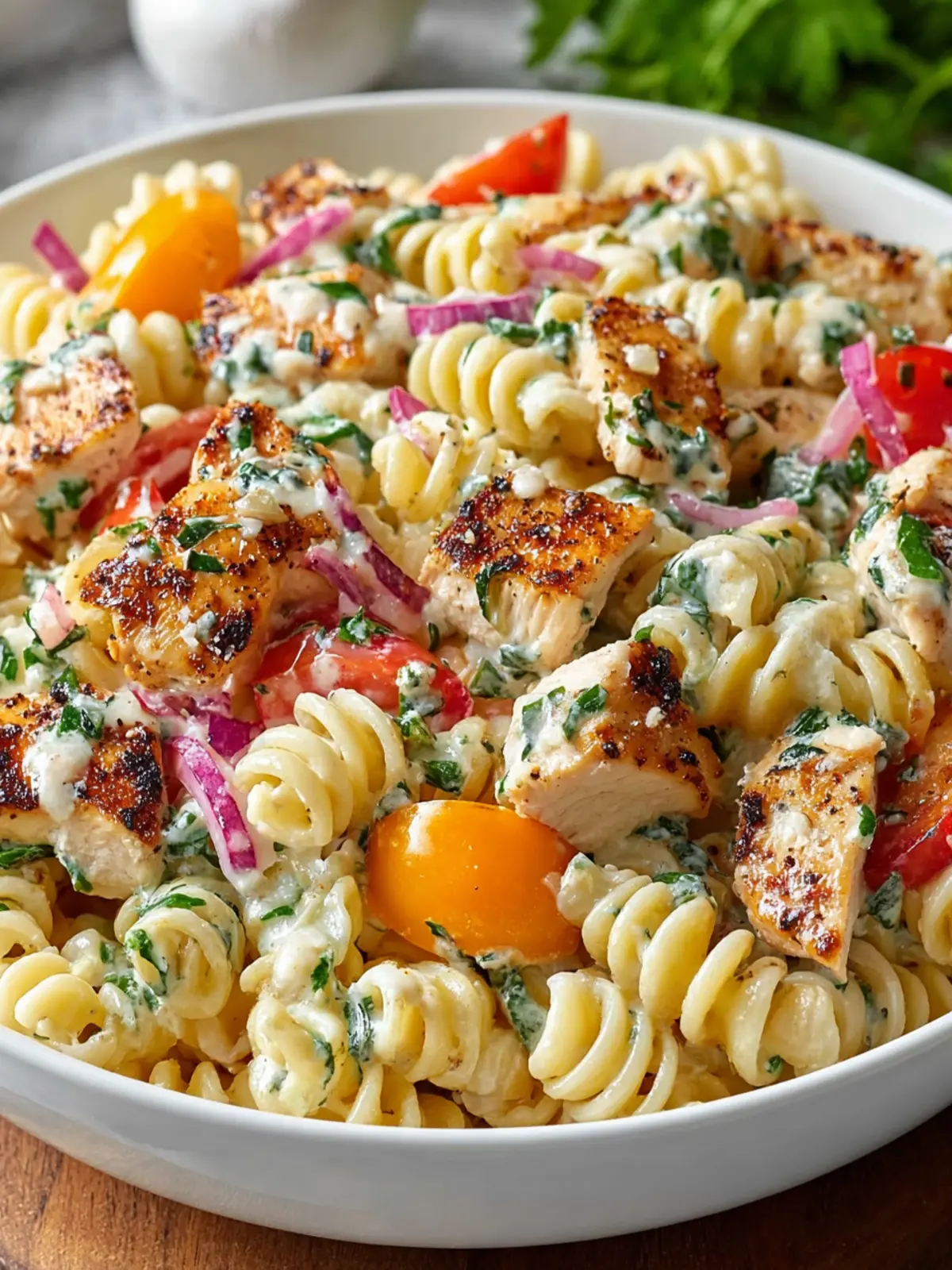 Herbs: Fresh herbs like parsley or dill can elevate the creamy chicken pasta salad with a dash of freshness that balances out the richness.