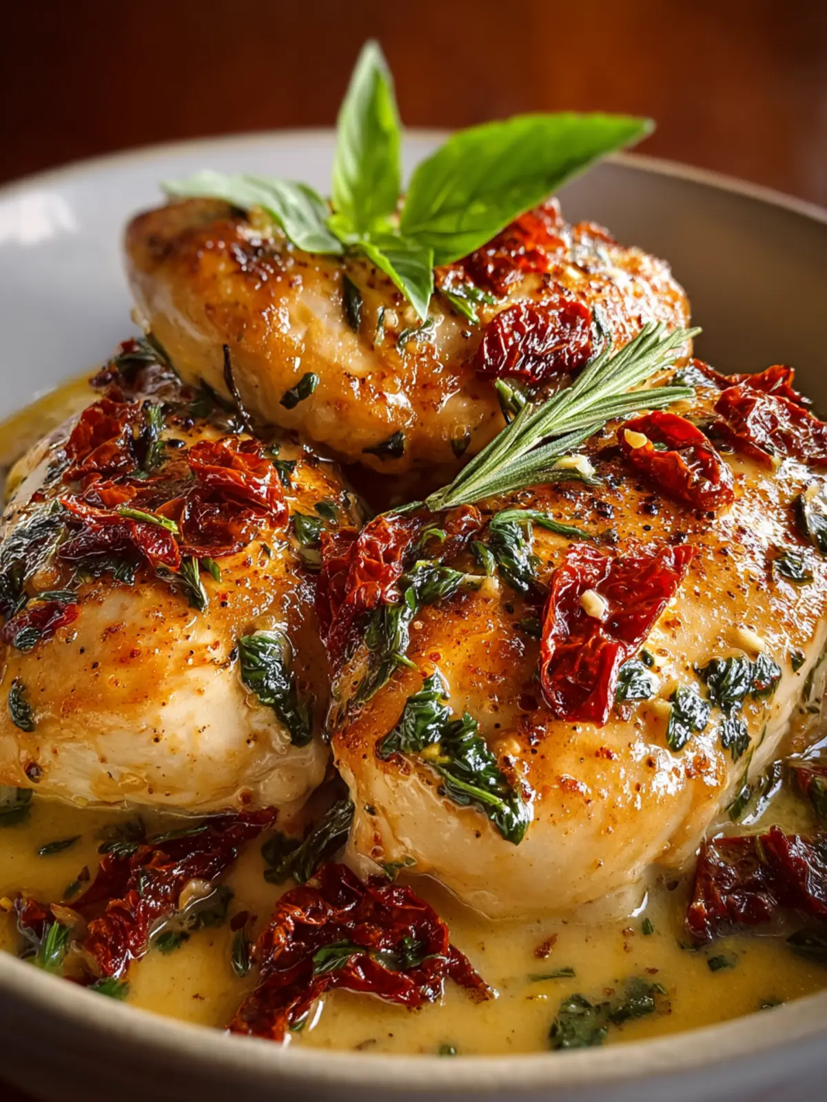 - Sprinkle the chopped sun-dried tomatoes and minced garlic over the chicken, making sure they’re distributed throughout the sauce.