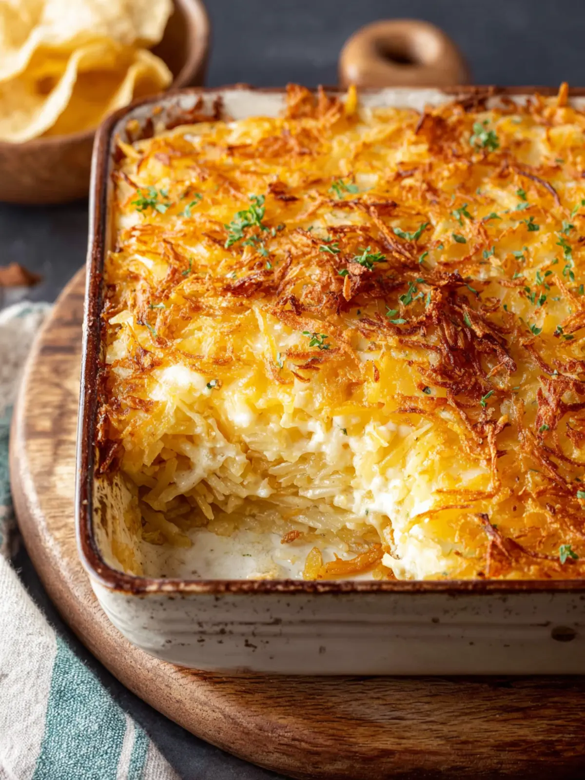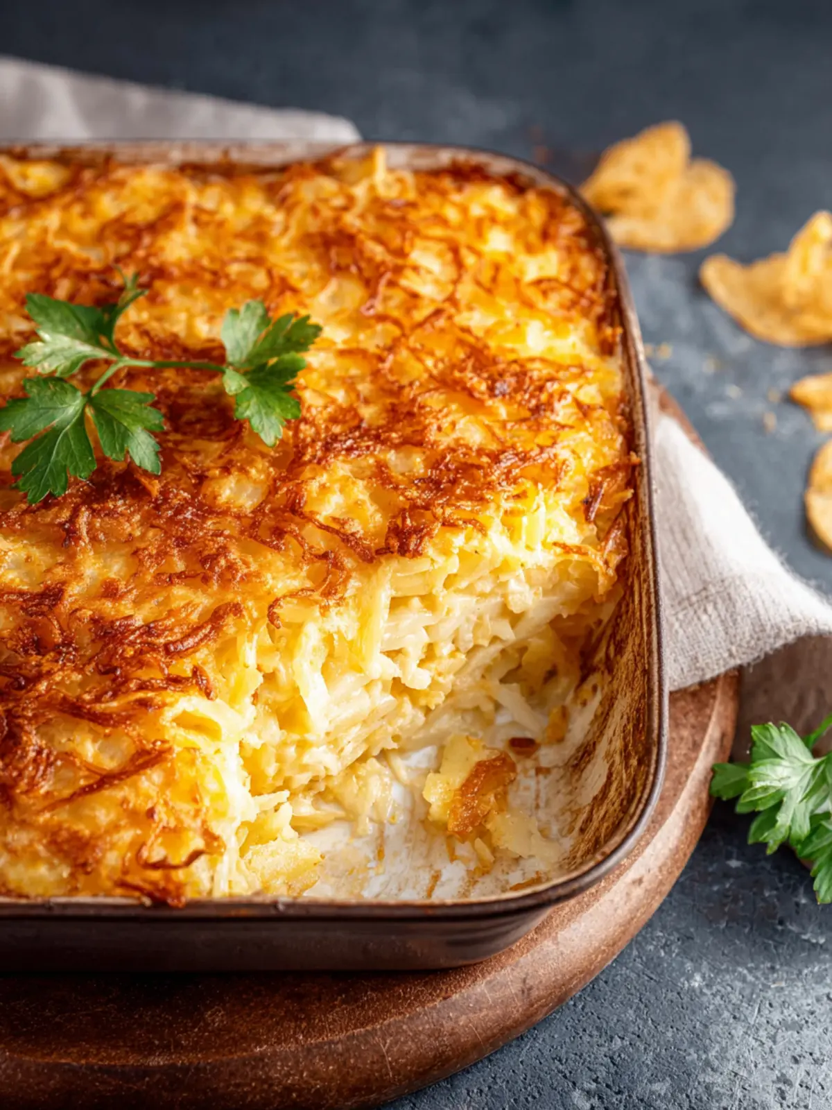 A delicious and creamy hash brown casserole packed with cheese and topped with crunchy corn chips.
