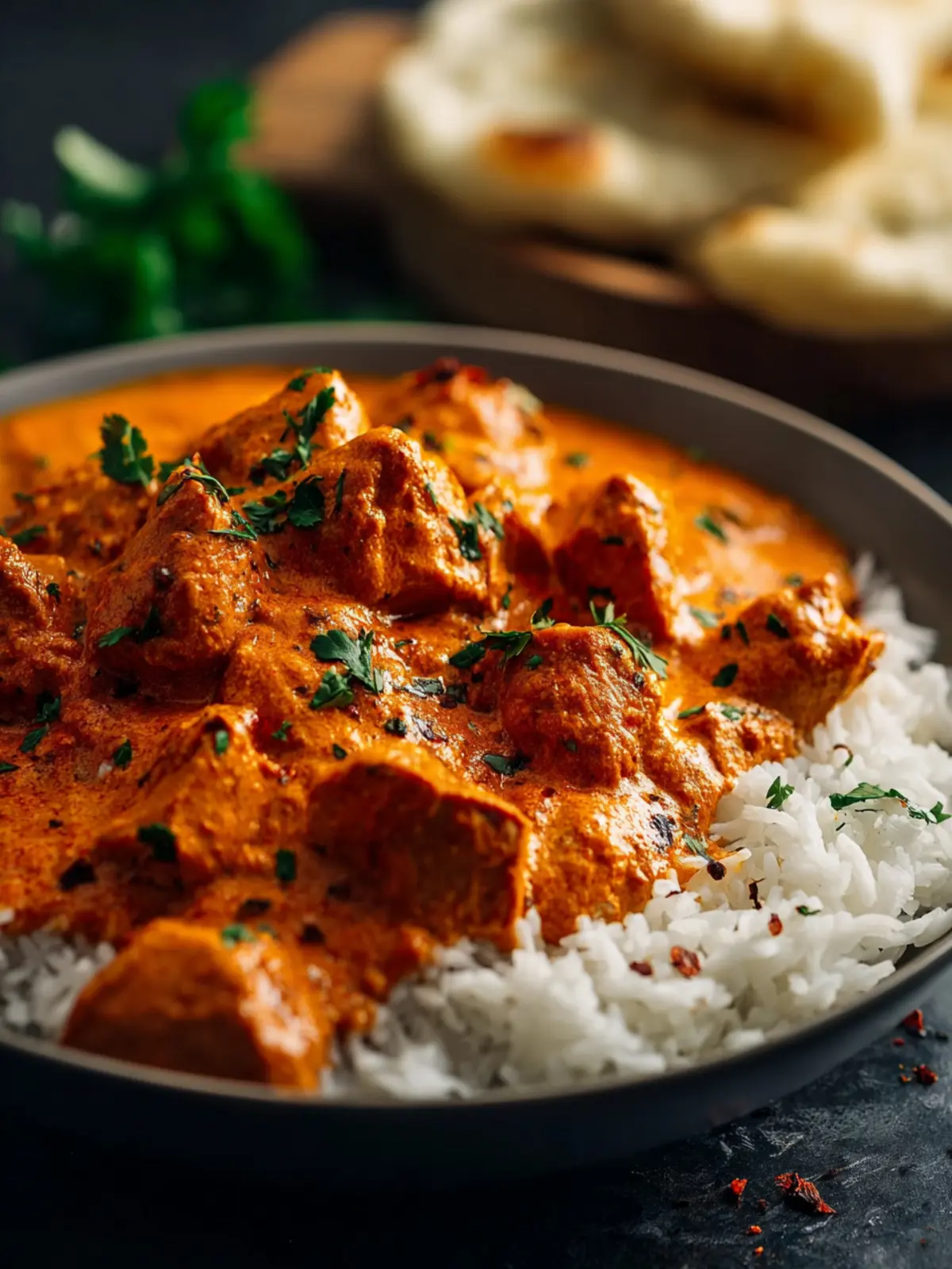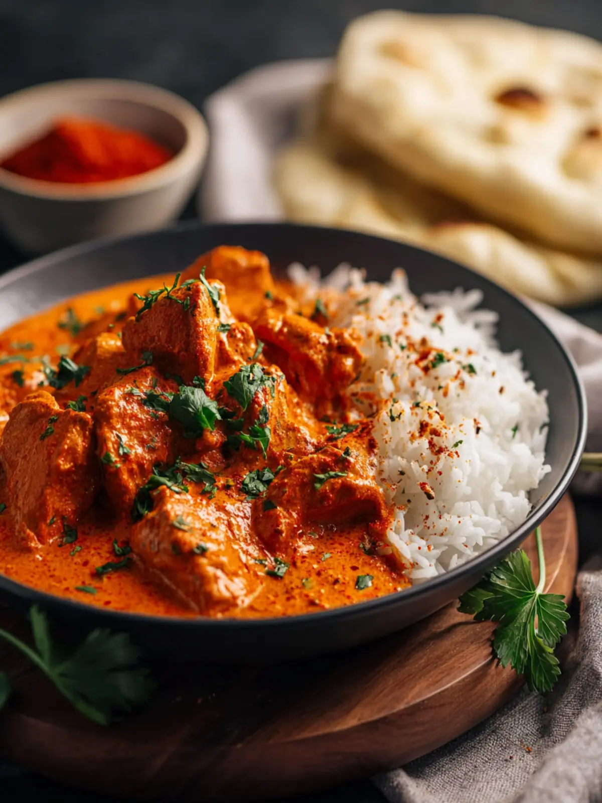 A rich and creamy chicken curry with aromatic spices, perfect for serving with naan or rice.