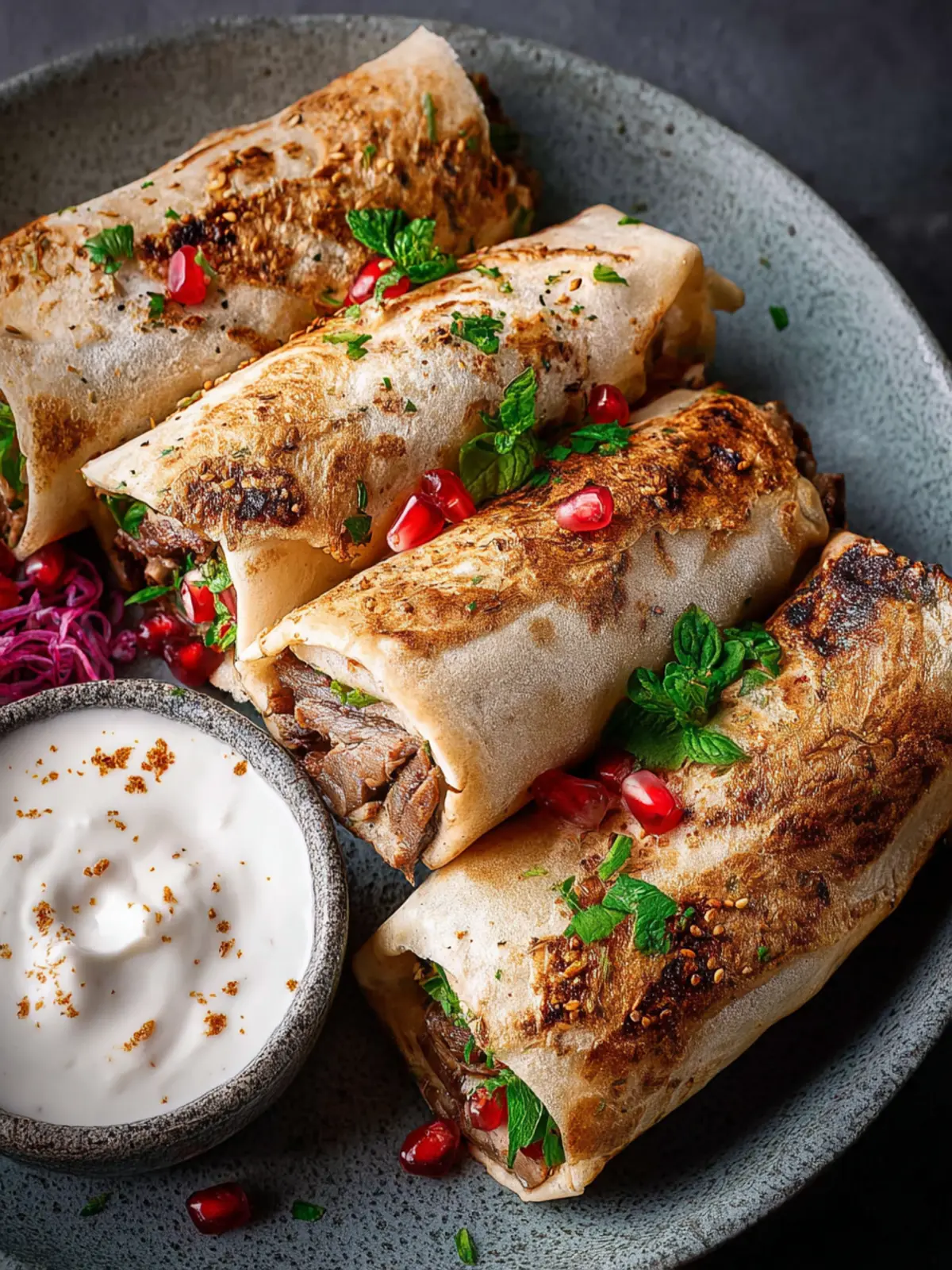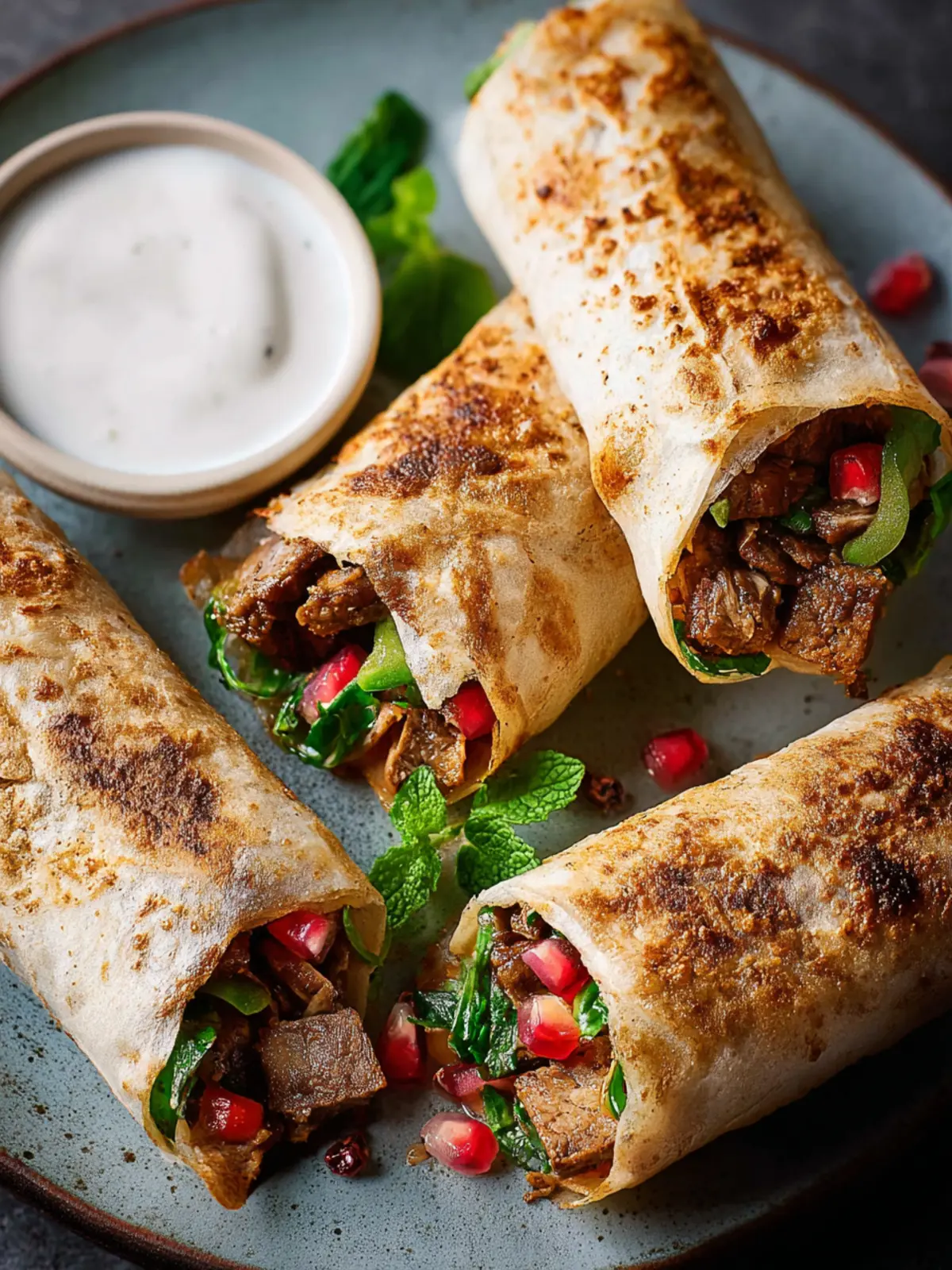 8. Serve. Garnish with toasted pine nuts, chopped parsley, a sprinkle of sumac and pomegranate seeds for sweetness. Serve the crispy rolls with yogurt or mint yogurt sauce.