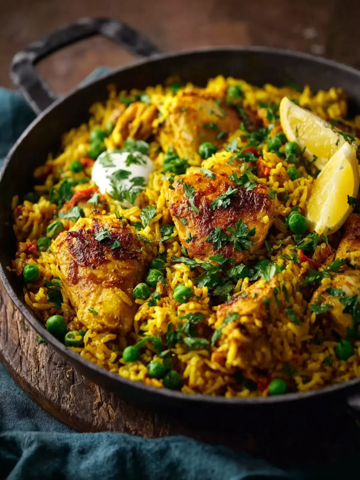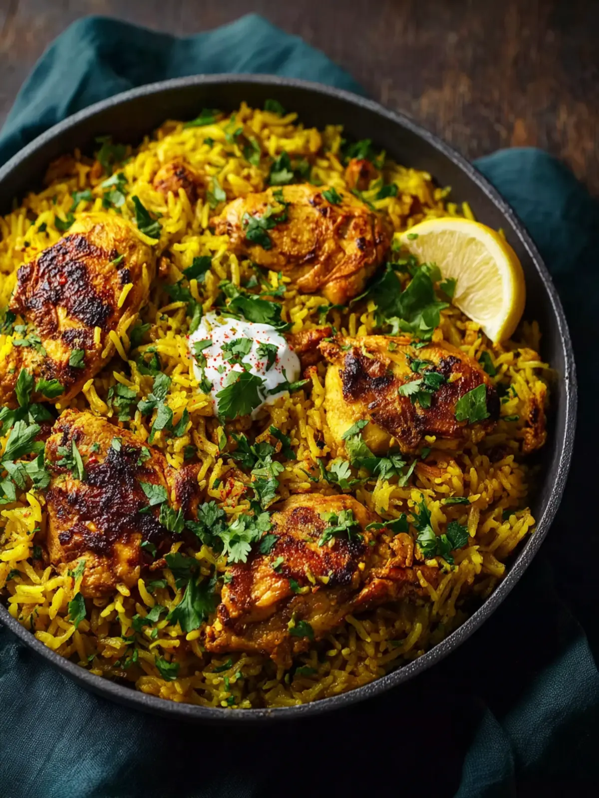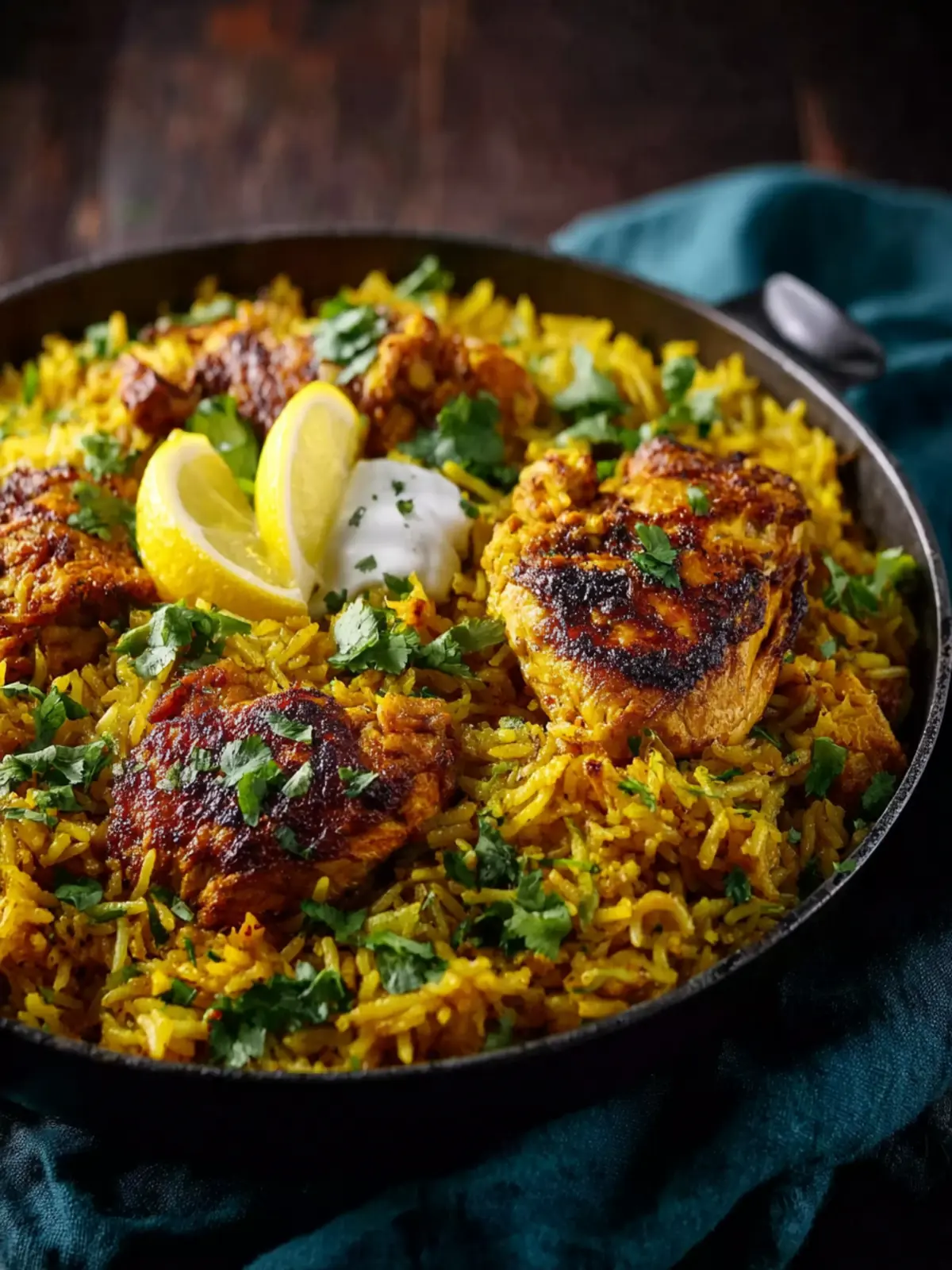 A vibrant and flavorful one-pan meal featuring seared chicken thighs, aromatic spices, and fluffy rice.