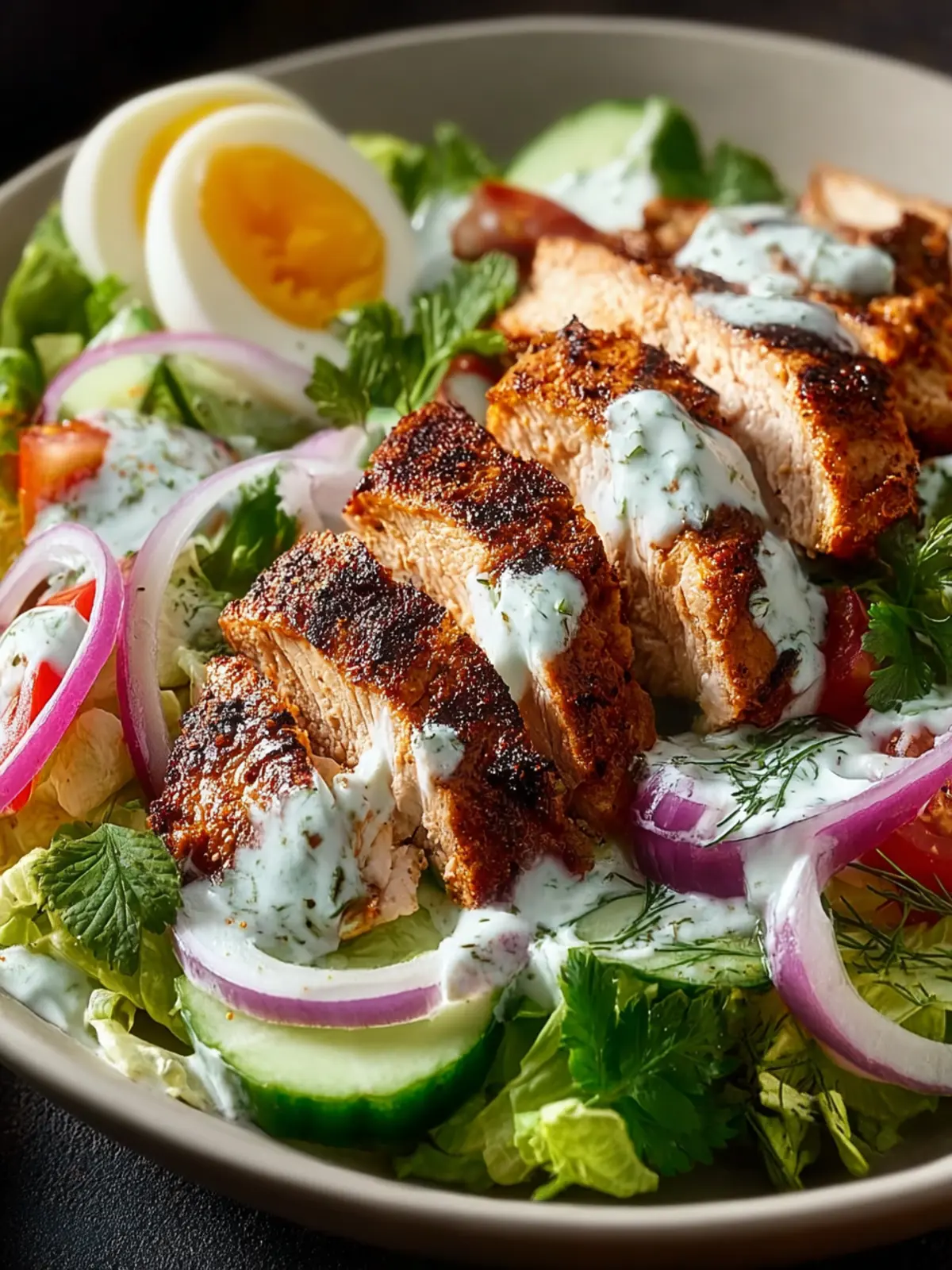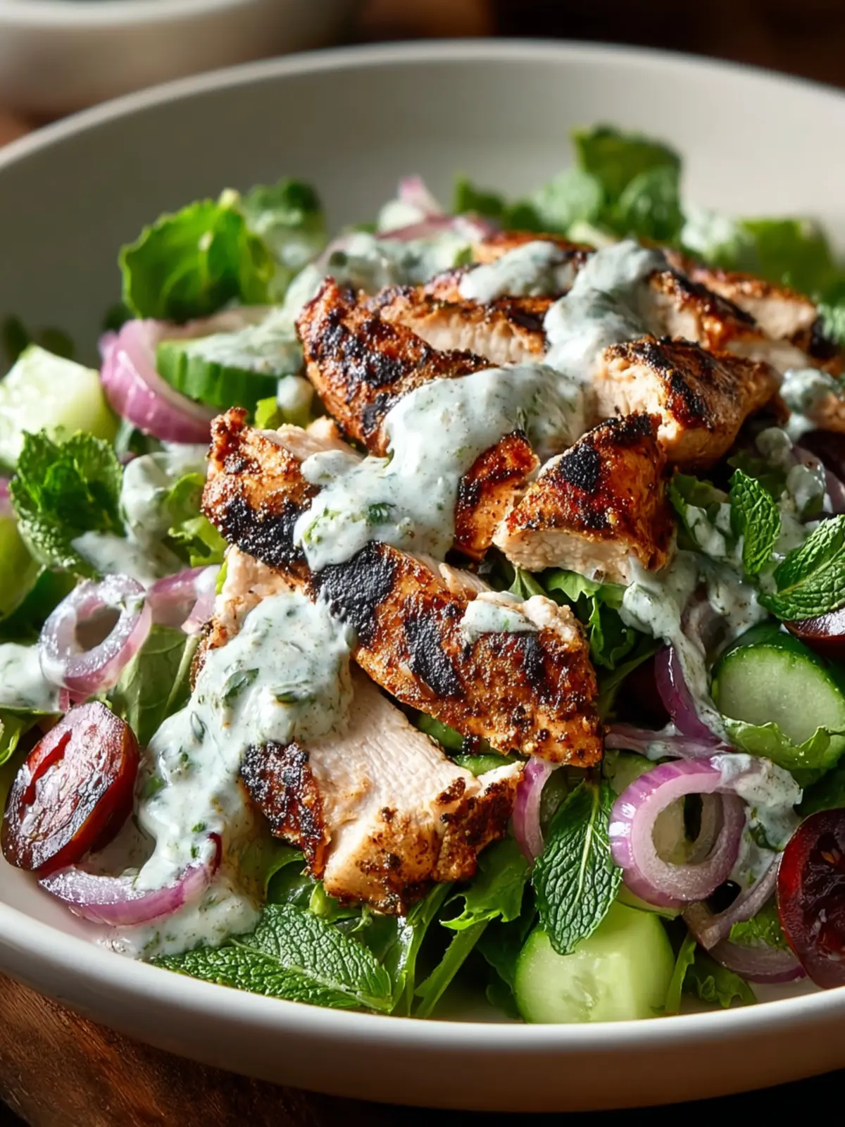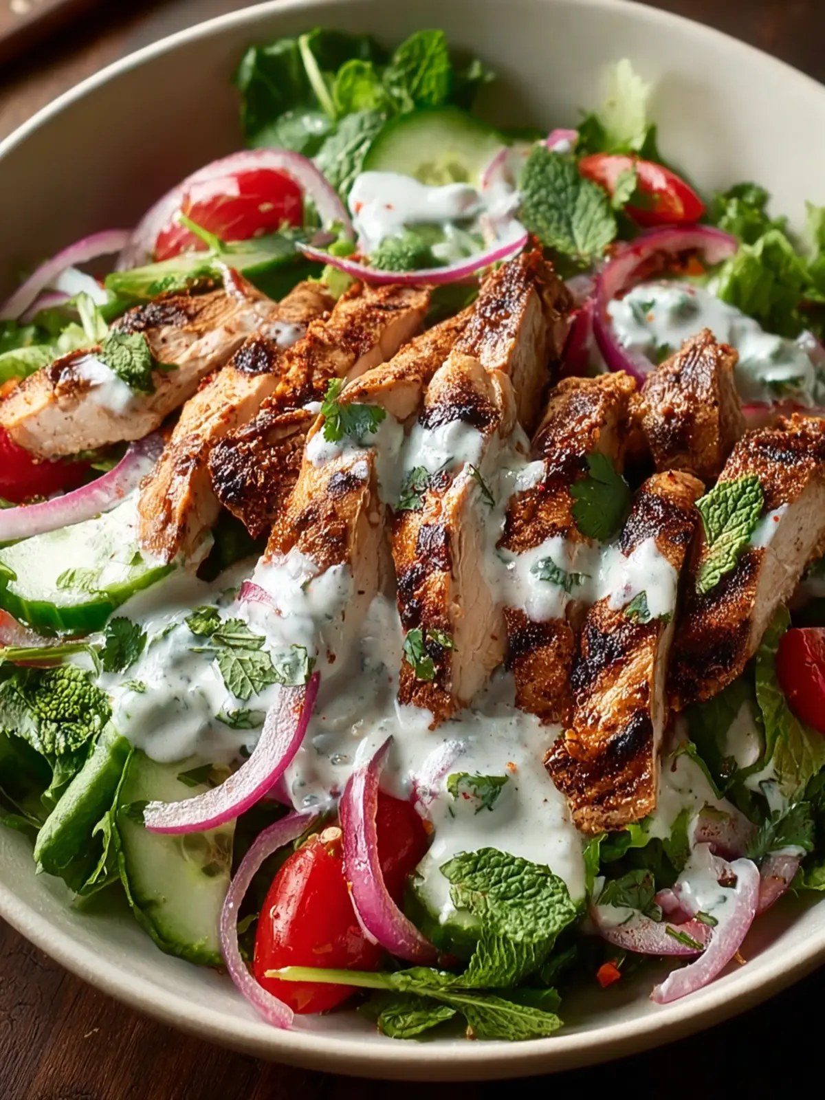 - Slice the cooked chicken and serve over mixed greens with a generous drizzle of yogurt sauce.